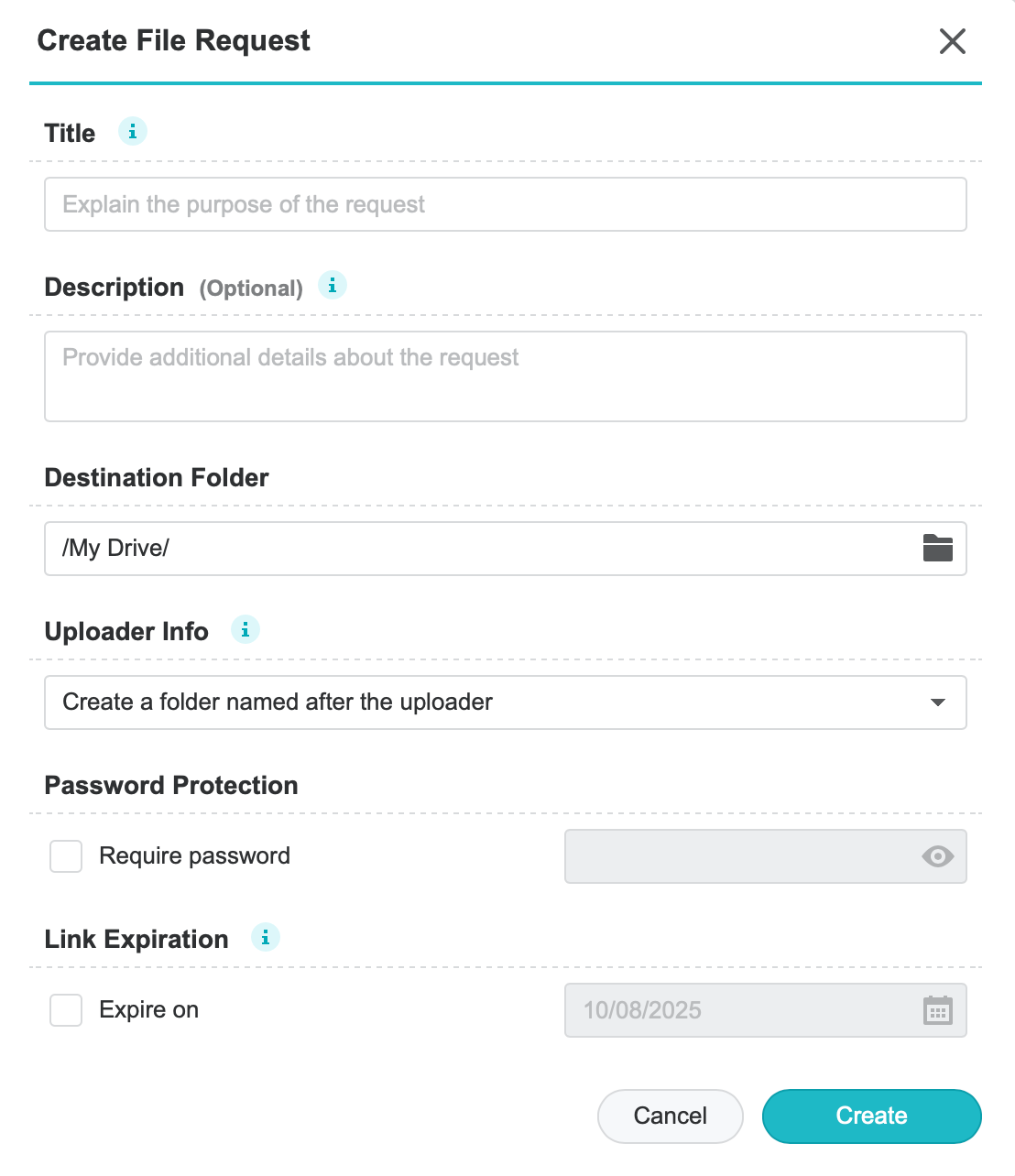 Zahtjev za datoteku može biti zaštićen lozinkom, a link se može postaviti tako da istječe nakon određenog vremena ili datuma.