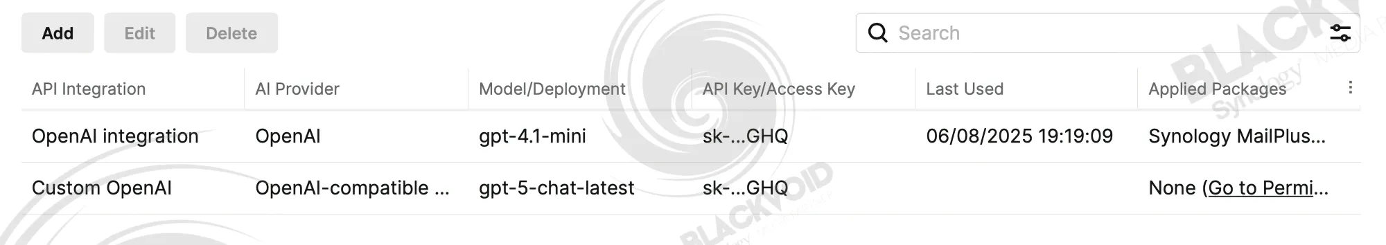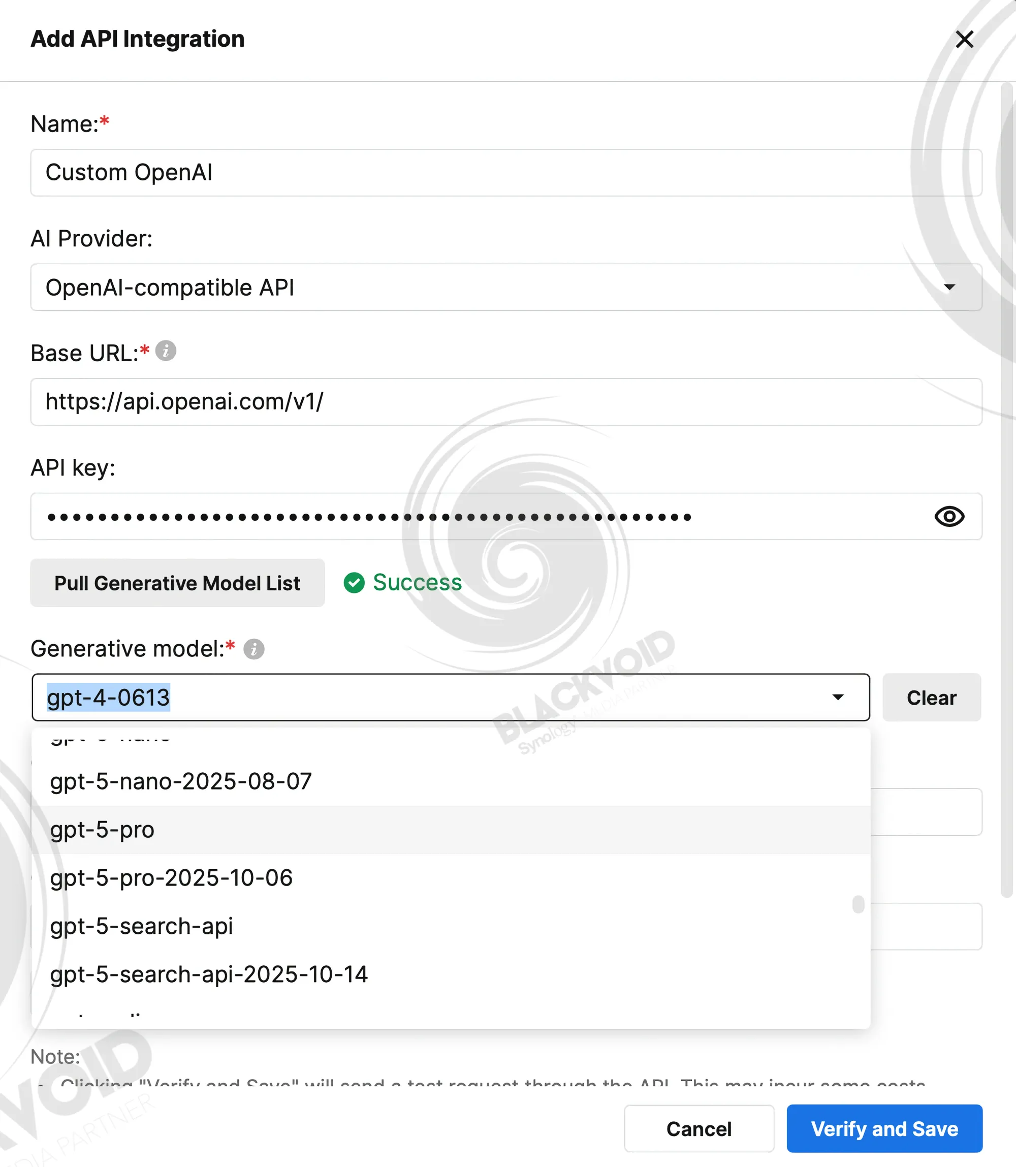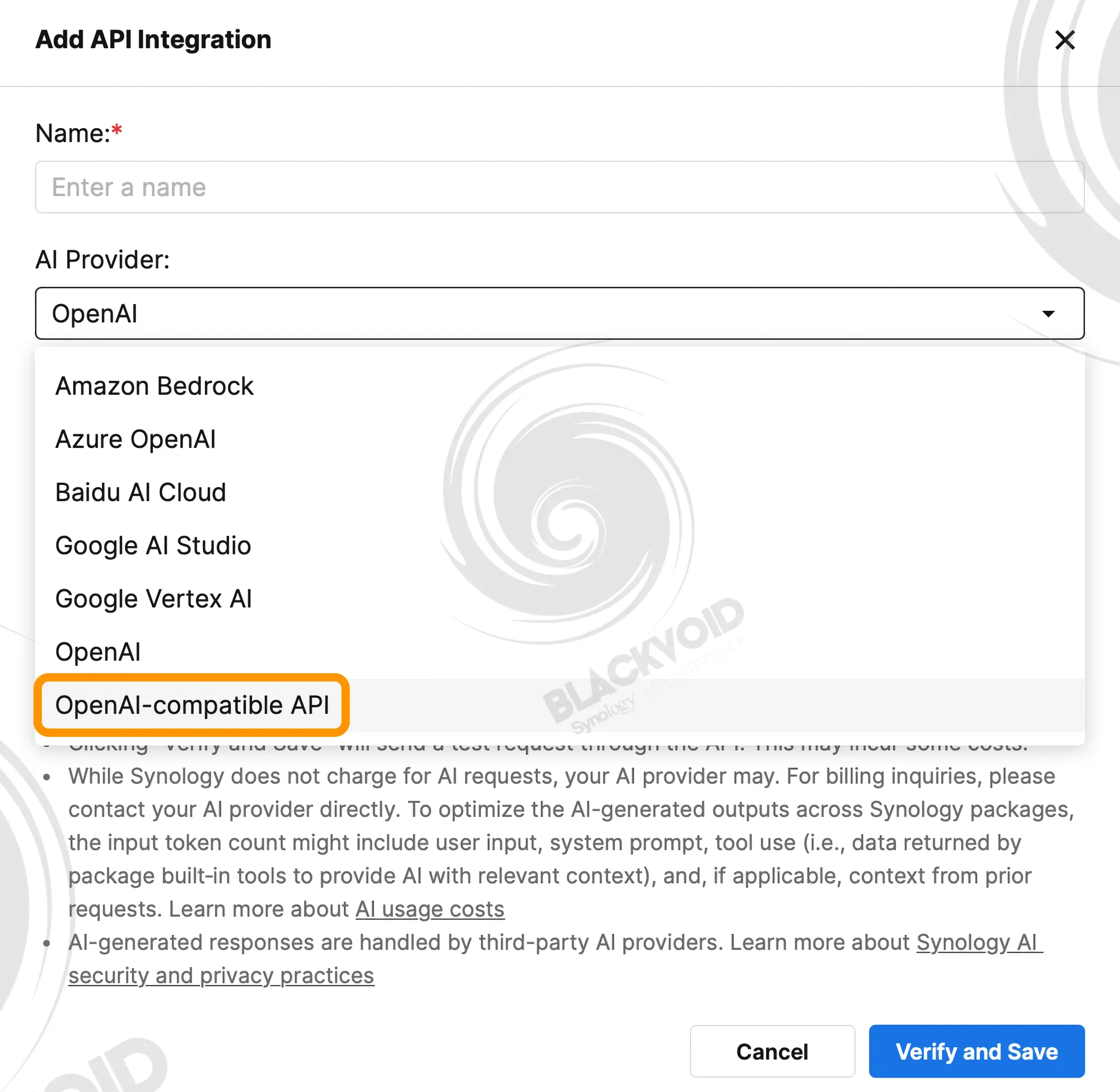 Unoseći URL adresu te, po potrebi, API ključ, korisnici mogu odabrati bilo koji konfigurirani i dostupan model koji pružatelj nudi. Time se omogućuju višestruke integracije iz istog pružatelja s različitim modelima, koje se zatim mogu konfigurirati na pojedine Synology aplikacije prema potrebi.