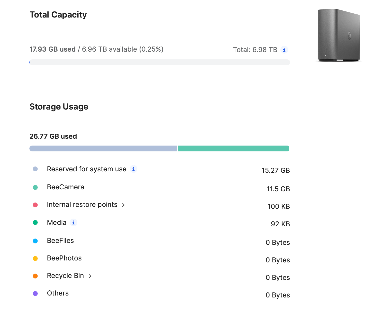 Uz zadanu postavku čuvanja zapisa od 30 dana, kontinuirano snimanje 24/7 zahtijevalo bi otprilike 1 do 1,5 TB prostora za pohranu. S obzirom da BeeStation model ima 7 TB dostupnog prostora, dodjeljivanjem otprilike 20% prostora mjesečno za nadzor tijekom cijelog dana ostavlja dovoljno prostora za kontinuirano snimanje bez neposrednih problema s kapacitetom.