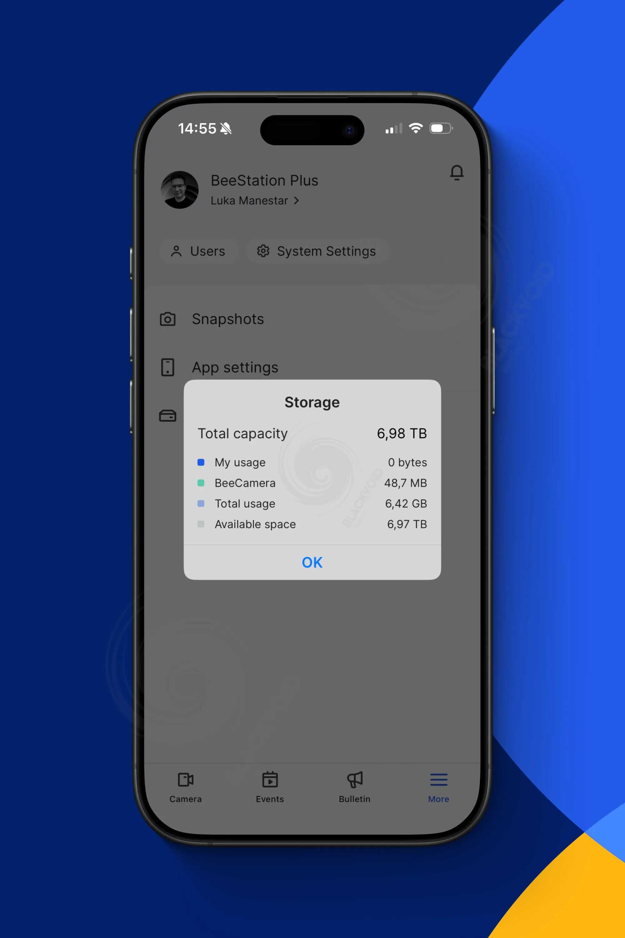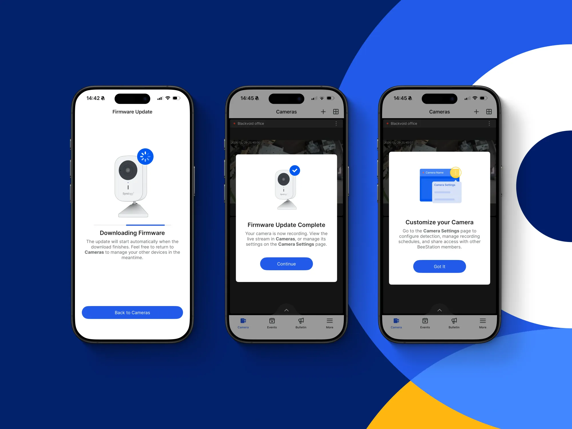 Osim osnovnih značajki Surveillance Stationa, aplikacija BeeCamera nudi očekivane funkcionalnosti s vlastitim sučeljem. Uz karticu kamere, tu su i kartice Događaji i Obavijesti, koje omogućuju brzi pregled pokretnih ili trigger događaja, obavijesti i vremenski definirane prečace. Ove funkcije omogućuju korisnicima da brzo pregledaju ili preuzmu snimke izravno na svoje mobilne uređaje.
