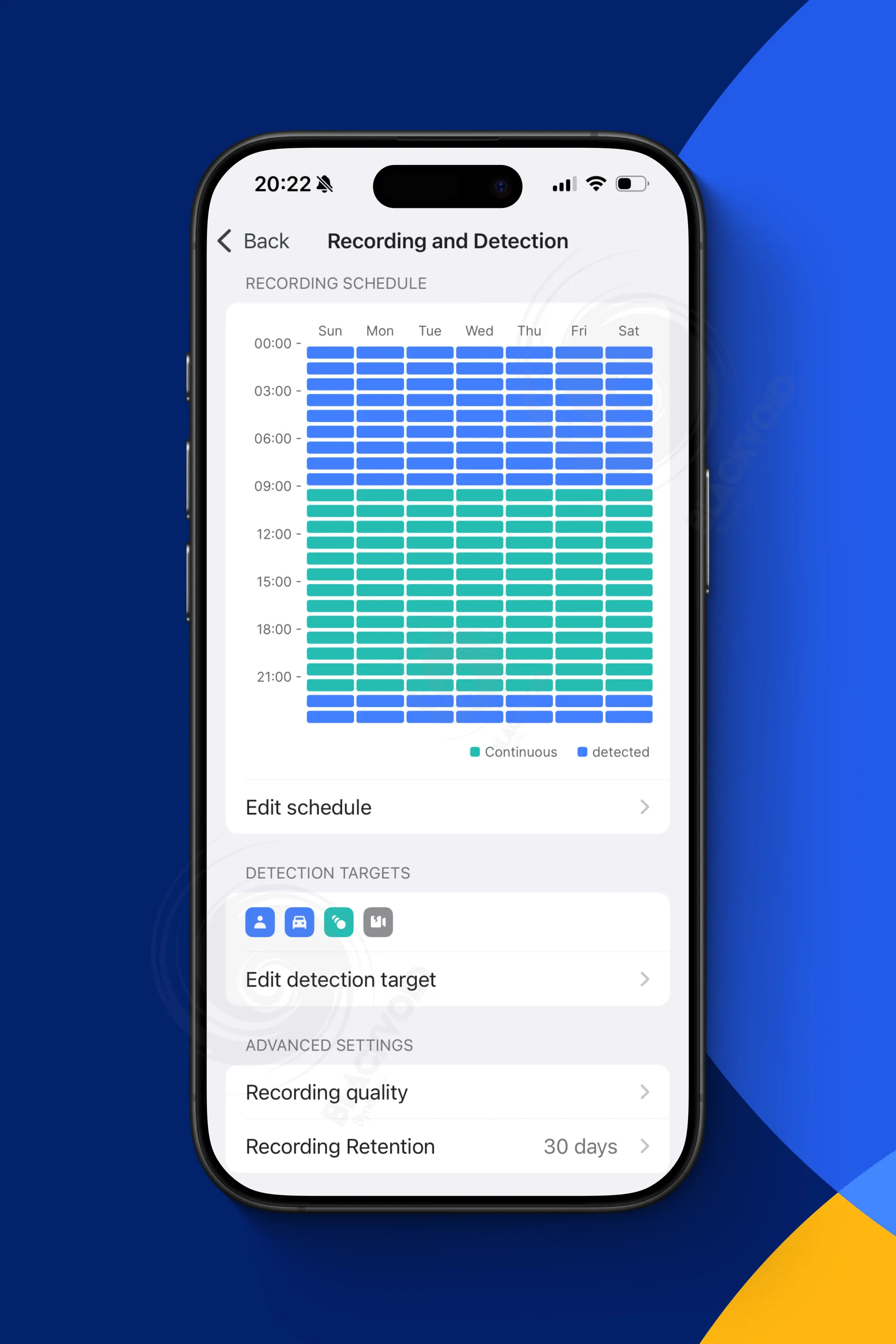 Postavke snimanja i detekcije koje nude detaljan raspored, ciljeve detekcije, definiranje zona te kvalitetu i trajanje snimanja