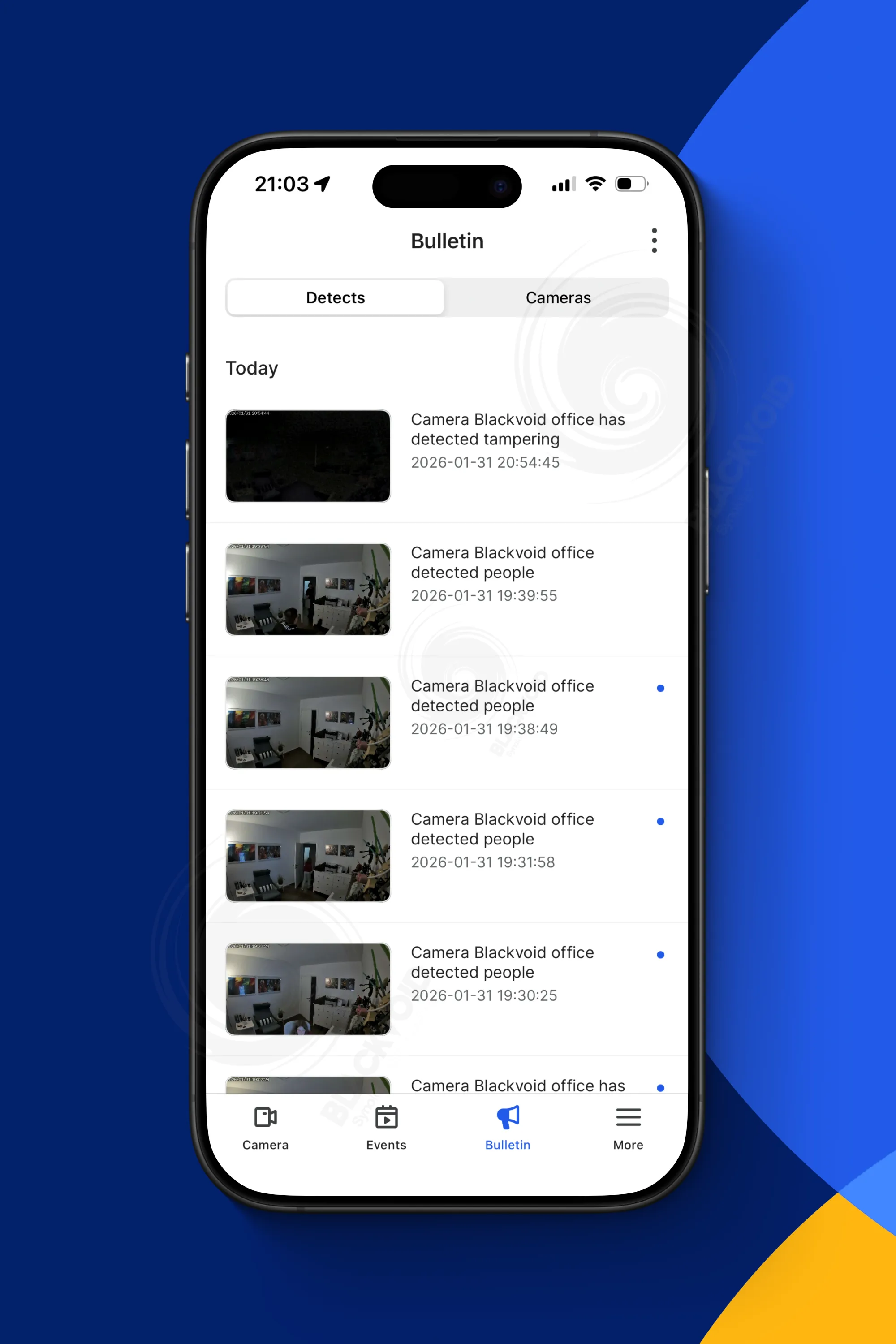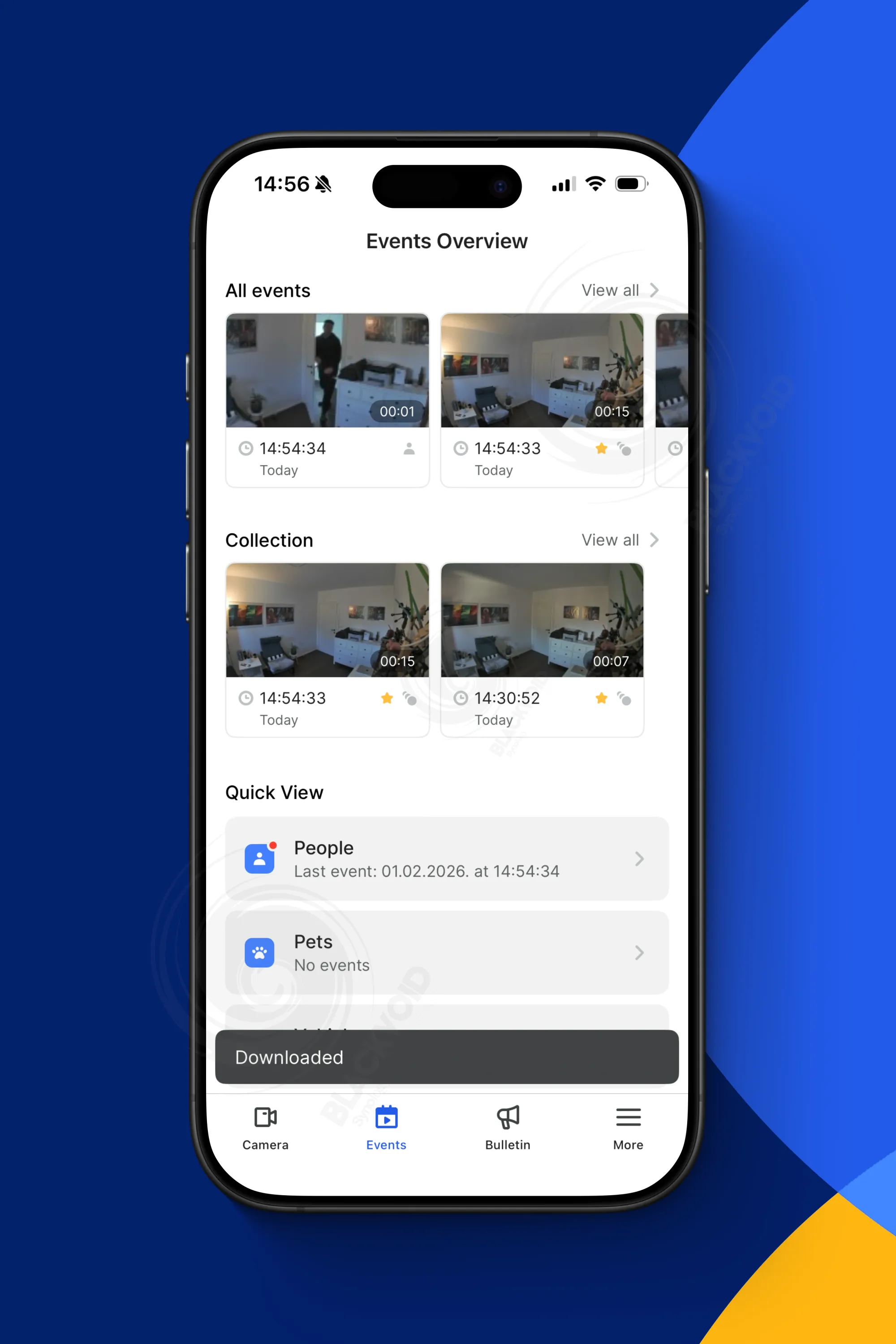 Pregled događaja omogućuje brz pristup snimkama, opcijama za preuzimanje i kolekciju, dok "bulletin" prikazuje popis posljednjih 100 obavijesti o događajima